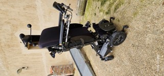 Si tratta di una carrozzina con funzione di verticalizzazione, che permette sia la messa in piedi della persona sia la posizione completamente sdraiata.